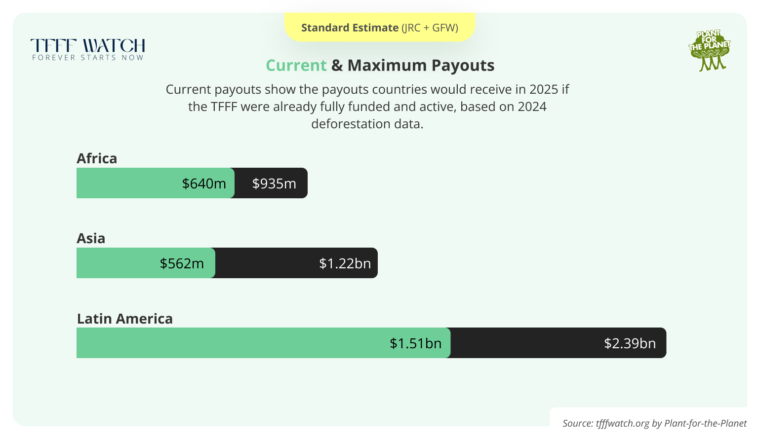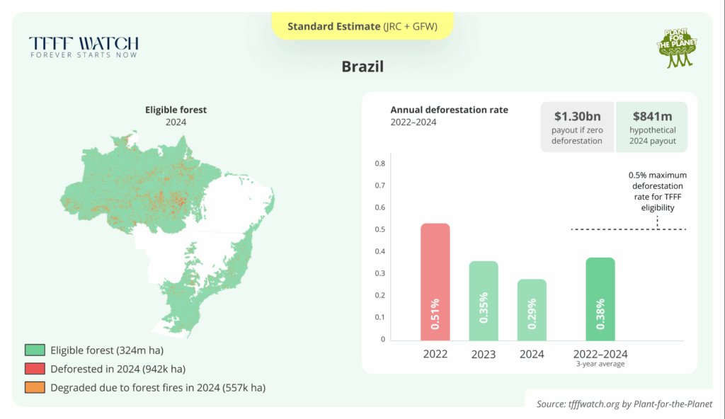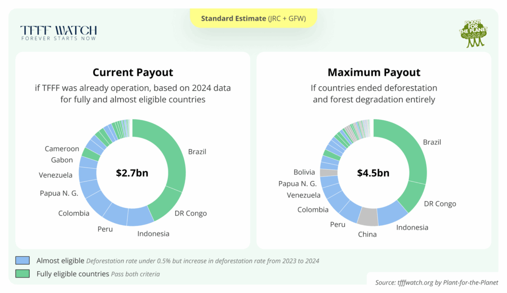 - We estimate potential payouts based on current (up to 2024) deforestation data. By the time the TFFF becomes operational, 2025 deforestation data will be available and that will impact which countries are eligible. We will update our estimates as soon as that data becomes available.