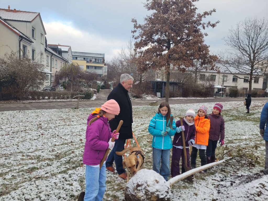 Am Nachmittag stand dann die Pflanzaktion im Mittelpunkt. Auf der Pflanzfläche lernten die Kinder mehr darüber, was es beim Pflanzen der Bäume zu beachten gibt und pflanzten selbst 12 große Obstbäume – Apfel, Birne und Kirsche! So konnten sie erleben, dass sie gegen die Klimakrise selbst aktiv werden können. Der 2. Bürgermeister Kilian Körner ließ es sich auch hier nicht nehmen, persönlich bei der Pflanzaktion dabei zu sein. Mit tatkräftiger Unterstützung der Mitarbeitenden des Bauhofs kamen alle Bäume auch in kurzer Zeit in die Erde.