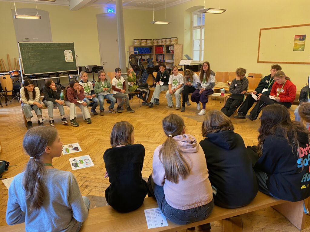 Nach einer Pause ging es in drei Gruppen in das nächste Modul – das Plan(t)- Spiel. Die Kinder durften selbst in die Rollen von Bürgermeister*innen, Aktivist*innen, Bürger*innen und Wirtschaftsvertreter*innen schlüpfen, um zu versuchen, eine gemeinsame Lösung für ein durch die Klimakrise verursachtes Problem in ihrer Gemeinde zu finden. Anhand des lokalen Beispiels, lernten sie, wie schwierig und wichtig solche Entscheidungen sind. Sie konnten üben, Ideen zu entwickeln, diese zu vertreten und die Erfahrungen mitnehmen. Dadurch wussten sie, dass jede Stimme in der Gesellschaft das Recht hat, gehört zu werden.